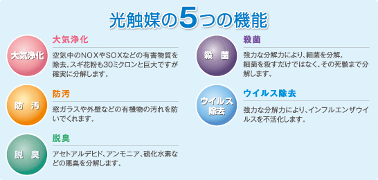 光触媒は太陽や蛍光灯の紫外線を吸収し、酸素や水から活性物質を生成させ、臭気物質、細菌、ウイルスなどを酸化分解し、無害化します。有機物の酸化分解により、殺菌・消臭効果等を発現します。